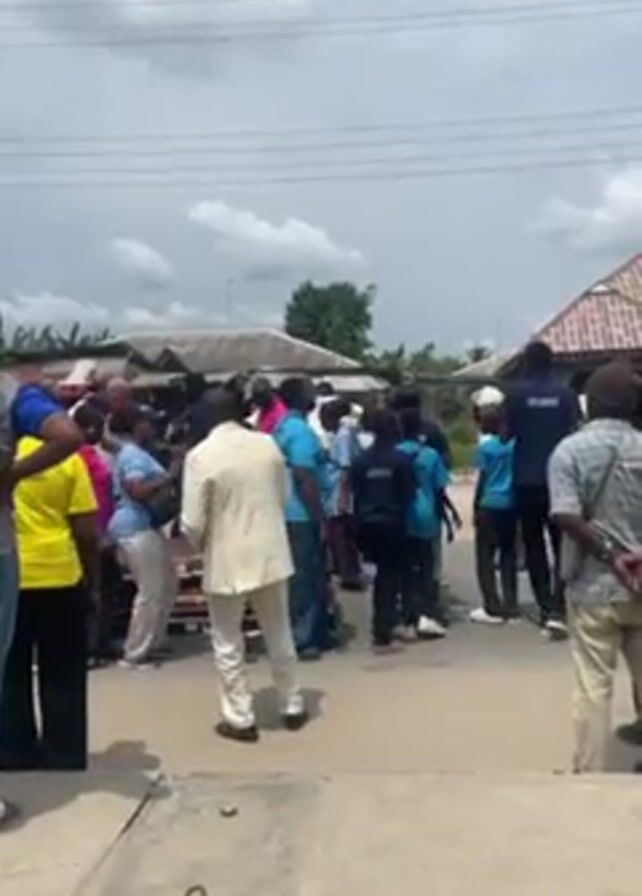 A group of people are standing together in what looks like a neighborhood street. There are men and women of different ages, some in casual clothing, others in uniform, and one man in a white suit. In the background, there are some buildings with corrugated metal roofs. Some people are standing on the sidewalk, and others are on the road. There is the sound of a drum playing. The people seem to be enjoying a local event.