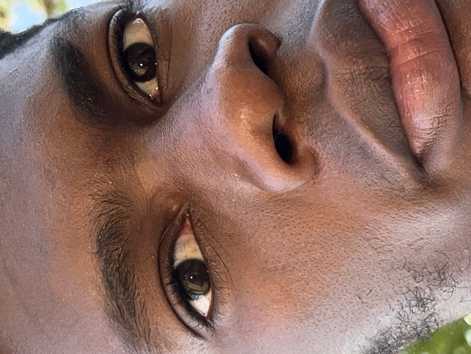 The image presents a close-up portrait of an individual, focusing on the eyes, nose, and mouth. The subject has dark brown skin, dark brown irises, and prominent eyebrows. Both eyes are open, with some minor redness visible in the lower sclera of the subject's right eye. The nose is broad, and the lips are full and slightly parted. Sparse dark facial hair is visible on the lower left cheek and jawline. The individual's expression appears neutral. The background is heavily blurred with indistinct green and yellow hues, consistent with an outdoor environment and natural lighting. No specific objects or interactions are depicted beyond the subject's face. The precise location in the city of Du, Nigeria, is not visually identifiable from the image content.