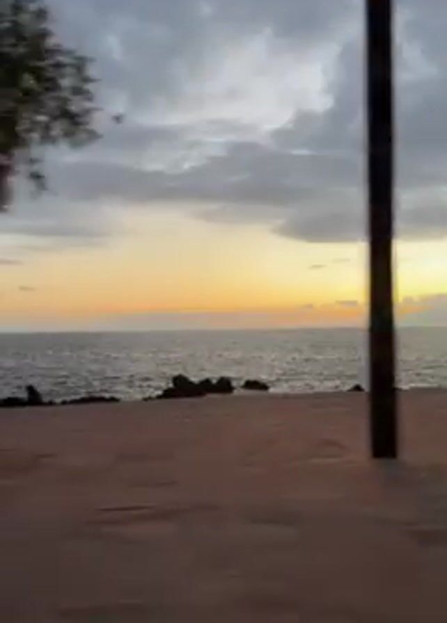 two figures sitting on benches facing the sea at dusk or dawn. The sky is cloudy with a gradient of orange light near the horizon. A tree is planted in a small circular area near the benches. The ground is paved with what looks like light-colored tiles.