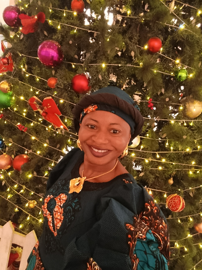 A woman stands in front of a brightly lit Christmas tree. She wears a blue dress with an intricate patterned design and matching head covering. A gold necklace and earrings add to her festive attire. The Christmas tree is adorned with various ornaments, including red and pink balls, along with numerous twinkling lights.