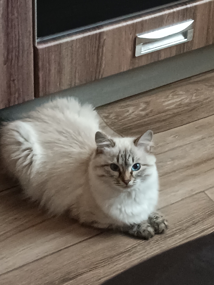 The image captures an indoor scene in Noviy, Russia, depicting a single feline subject. The cat possesses predominantly cream-colored, long fur with distinct tabby markings on its face, ears, and paws. Its eyes are a bright blue. The animal is positioned in a resting "loaf" posture on a light brown floor, which exhibits a wood-grain pattern consistent with laminate or vinyl planks. In the background, a piece of furniture or cabinetry with a similar wood-grain finish is visible, featuring a horizontal silver-toned pull handle and a dark, rectangular recess directly above it. A dark grey strip runs along the base of the furniture, separating it from the floor. The cat is facing forward, appearing to look towards the viewer. No other subjects or actions are depicted.