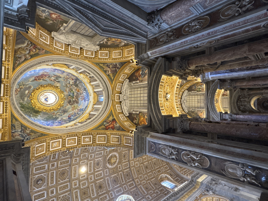 The image displays a detailed, upward-angled view of the highly ornate interior of St. Peter's Basilica, Vatican City, Vatican City. A large, circular dome dominates the upper center, featuring a central oculus and an extensive fresco depicting numerous celestial figures and saints against a blue, cloudy sky. This dome is encircled by a wide, gilded, and sculpted frieze, with additional painted narrative panels below. To the left, a portion of a vast, coffered ceiling is visible, composed of deeply recessed square and rectangular panels, each containing intricate, raised gilded decorative motifs. Massive structural elements, including vertical pilasters and columns, are constructed from reddish-brown, veined marble. These pillars are adorned with white, three-dimensional sculptural reliefs depicting cherubic figures and ecclesiastical busts. Arched openings and rectangular windows with multi-pane grids are present at various architectural levels, some positioned above detailed fresco paintings. The entire visible space is characterized by lavish use of gold leaf, polished marble, and extensive decorative artwork. No living individuals are present within the captured scene; all figures are artistic representations.