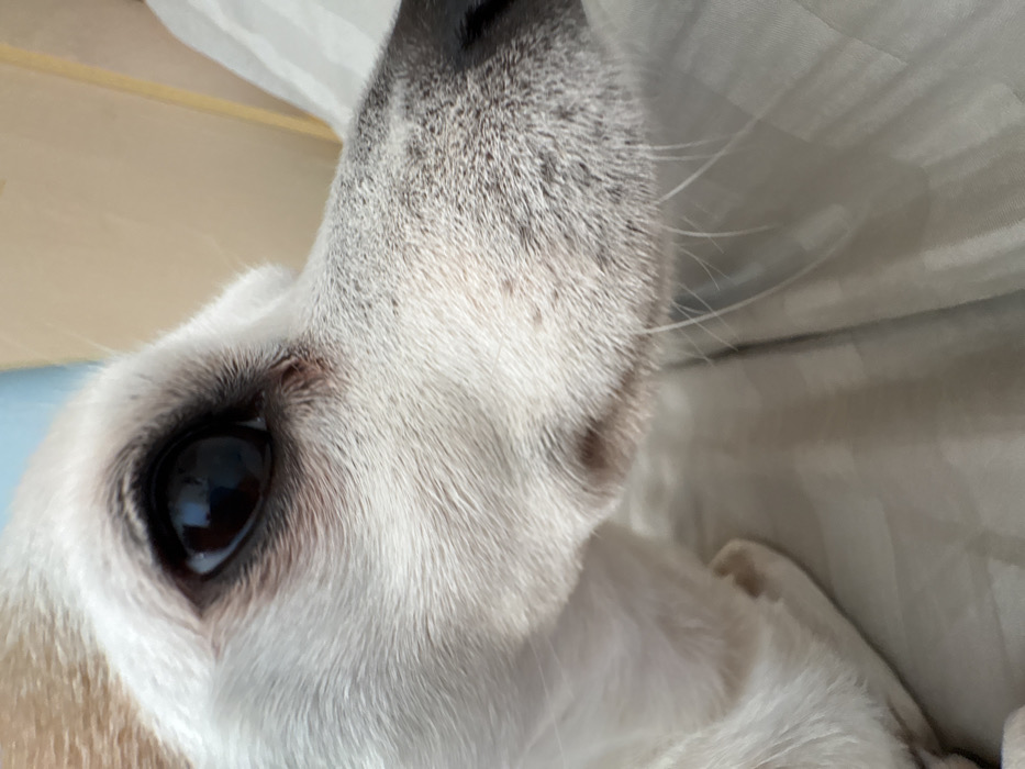 The image depicts a close-up, angled view of a dog's face, identified as located within the city of Burgas, Bulgaria. The primary subject is an animal, a dog, characterized by predominantly white fur on its face and neck, with a visible patch of light brown fur on the top of its head in the upper left quadrant of the frame. The dog's right eye is prominent, displaying a large, dark pupil and iris, with reflections indicating an unseen light source. A reddish discoloration or stain is present on the fur directly below the eye. The dog's snout, covered in shorter white and greyish hairs, extends towards the right, with several long, white vibrissae (whiskers) visible. The tip of the nose is partially cropped by the right edge of the frame. The dog's expression is neutral, and no specific action is discernible beyond its presence. The background is out of focus, suggesting a shallow depth of field, and consists of indistinct surfaces: a pale blue area in the upper left, a light beige or cream area in the upper right, and a textured, light-colored fabric, likely bedding, in the lower and middle-right portions of the frame. The scene suggests an indoor environment. No human subjects or discernible human interactions are present.