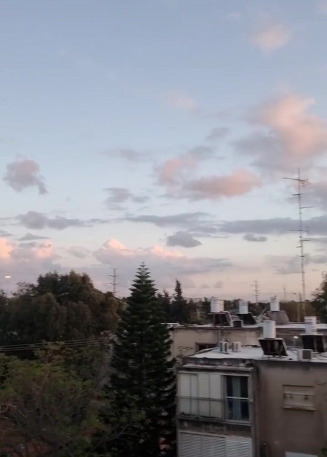 Here's a forensic description of the video: The video shows a sunset over a residential area. The sky is a mix of blue, white, and pink, with scattered clouds. Below the sky, there are several buildings, trees, and some utility poles. The camera pans from left to right, revealing the rooftops of the buildings and a small parking lot. The sun is setting behind some of the buildings, creating a bright glow in the sky. The camera seems to be stationary, filming from a balcony.