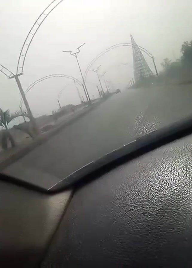 The video depicts a view from inside a vehicle, likely a car, driving on a paved road during a rainy day. The road appears wet and reflective. Along the sides of the road, there are lamp posts and arch-shaped decorative structures. A tall, cone-shaped structure is visible in the distance, resembling a monument. The sky is overcast, and the overall visibility seems reduced due to the weather conditions.