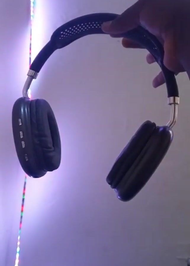 A person with dark skin holds a pair of dark headphones against a pale wall. A strand of small, multicolored LED lights runs vertically along the wall to the left of the headphones. The lighting in the room shifts in color. The headphones have a mesh headband and rectangular earcups.