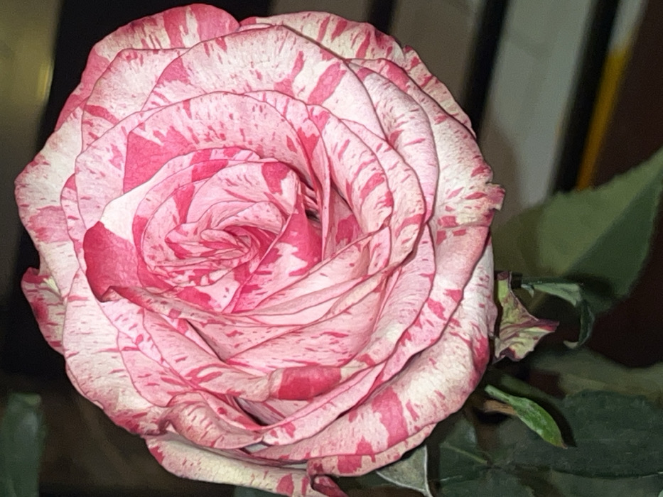 A captivating rose blossom dominates the scene. The flower exhibits a unique pattern of pink stripes and patches over a creamy white base. Its petals are tightly swirled at the center, gradually unfurling outwards. A few green leaves and a stem peek from behind the rose, providing a contrast to the flower's vibrant color. The background appears dark and blurred, which focuses attention on the rose.