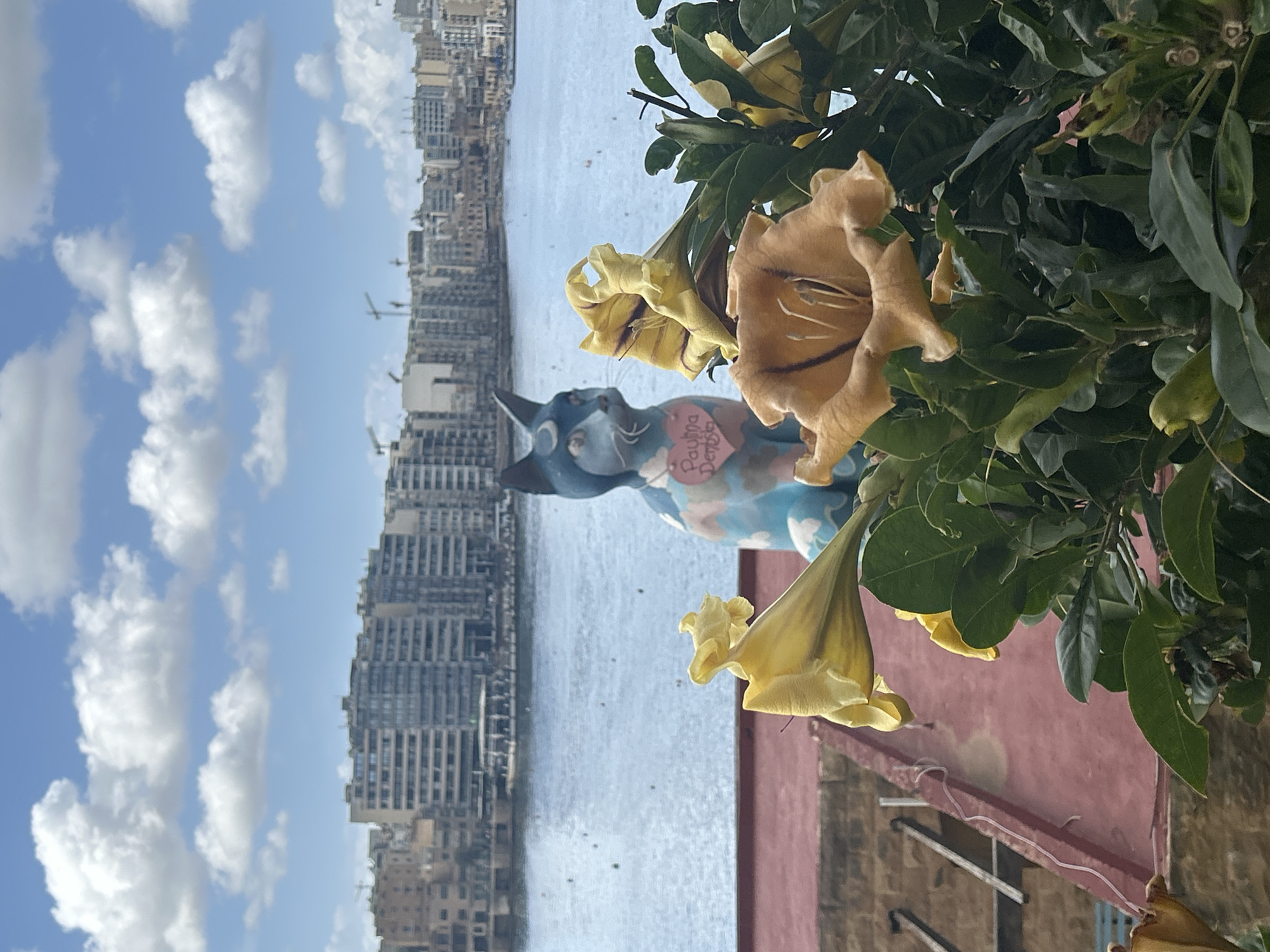 The image is a medium shot taken in Sliema, Malta. The foreground features large, bell-shaped, yellow flowers in bloom with green leaves, partially obscuring a painted blue cat statue. The statue has a pink heart on its side with illegible text. The background shows a cityscape with tightly-packed, tall buildings along a shoreline. The sky is blue with scattered white clouds. The water in the bay is choppy. A red wall is visible behind the flowers and statue.