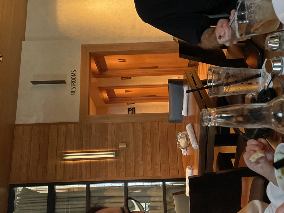 A restaurant interior shows a table with empty glasses and used napkins. Two people are at the table, one in a black jacket and the other partially visible on the right. A hallway leading to restrooms is visible, with signs indicating their location. The restaurant has wooden paneling and a long, thin light fixture. Windows are at the bottom of the frame.