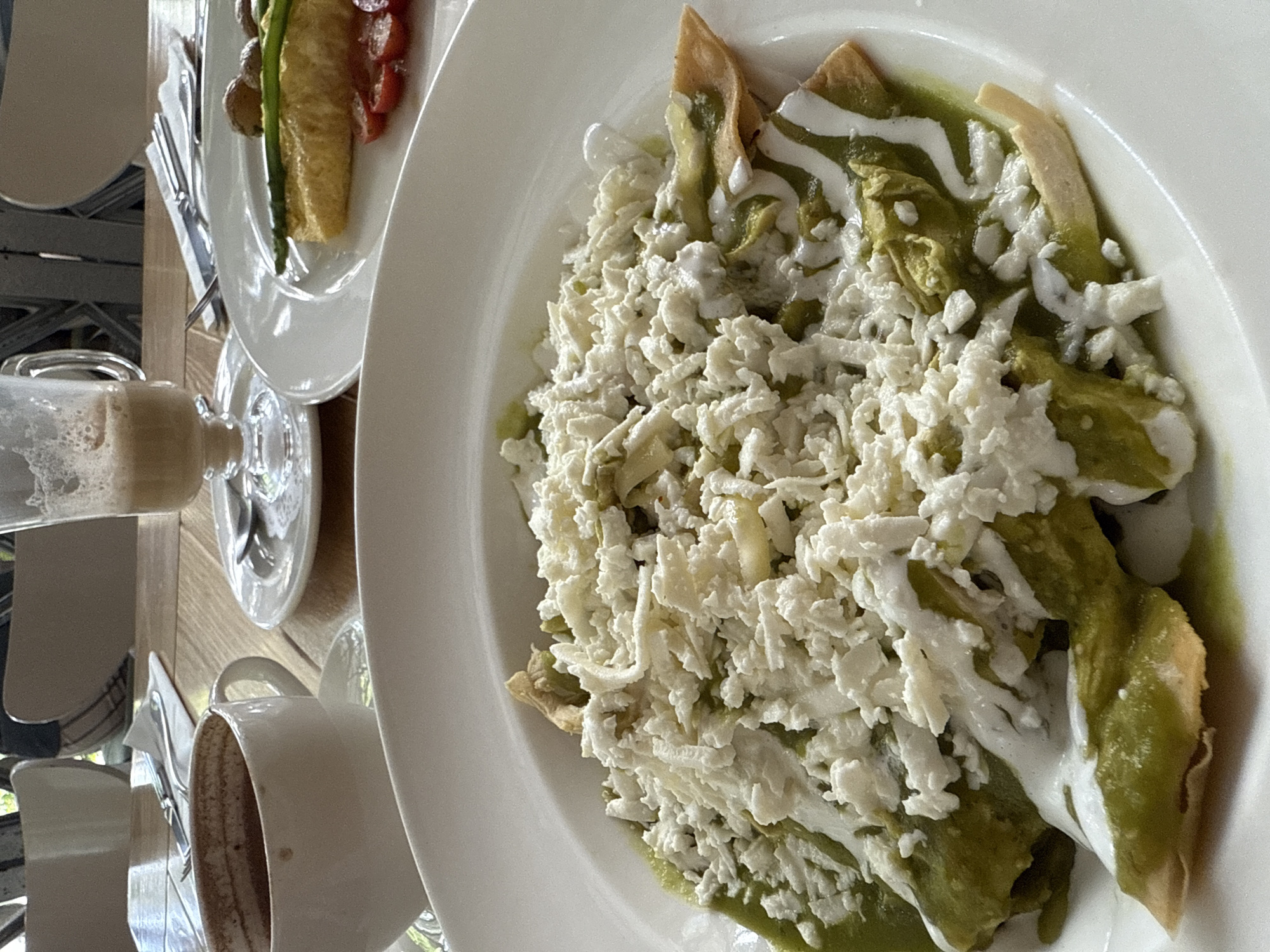 - "A close-up, tilted shot depicts a plate of enchiladas covered in white cheese, alongside a plate with what looks like an omelet and fruit, a glass of coffee, and a coffee mug on a wooden table, possibly in a restaurant" by FM-BAhUf2, licensed under CC BY 4.0