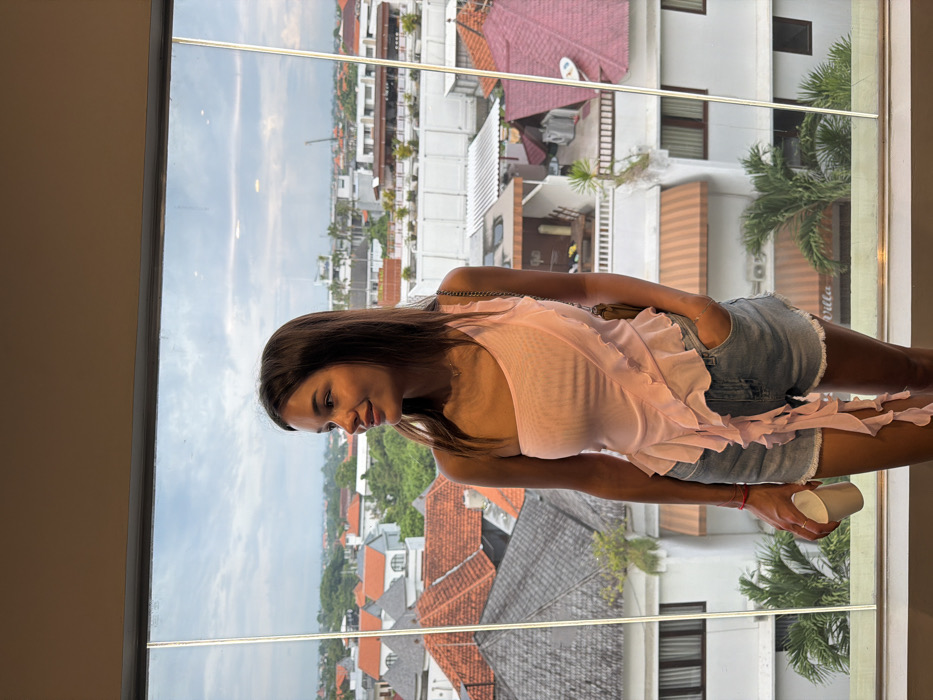 The image captures a young adult female standing indoors, positioned in front of a large window overlooking the city of Canggu, Indonesia