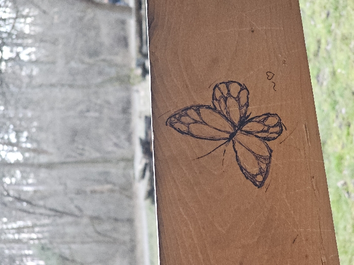 The image foreground features a horizontal light brown wooden surface, possibly a plank, occupying the lower two-thirds of the frame. Centrally positioned on the wood is a black ink or marker drawing of a butterfly, detailed with visible wing patterns. To the right of the butterfly, a small tilde symbol (~) is drawn, followed by a small heart symbol (♡). The wooden surface exhibits minor surface scratches and visible wood grain. The background is significantly blurred, depicting an outdoor natural environment. Bare deciduous trees, consistent with a dormant season, dominate the upper background. Below the tree line, a strip of green ground, likely grass, is visible. A dark, indistinct elongated object in the mid-ground may represent a pathway or a low wooden structure. This scene is located within a park or natural area in Sofia, Bulgaria, consistent with environments found in Vitosha Nature Park or a city park such as Borisova Gradina.