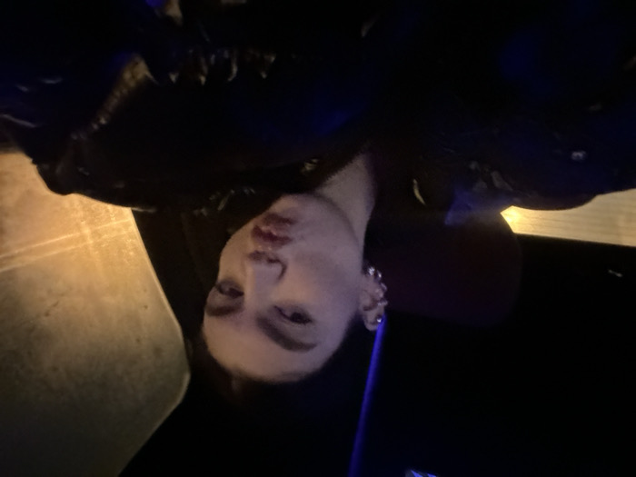 A person's face appears upside down in a dark setting, possibly a car interior. They have fair skin, visible earrings, and are puckering their lips slightly. A dark object, possibly a jacket, is above their head. Light is visible on the left side, suggesting an outside light source. The overall image is dimly lit and somewhat obscured.
