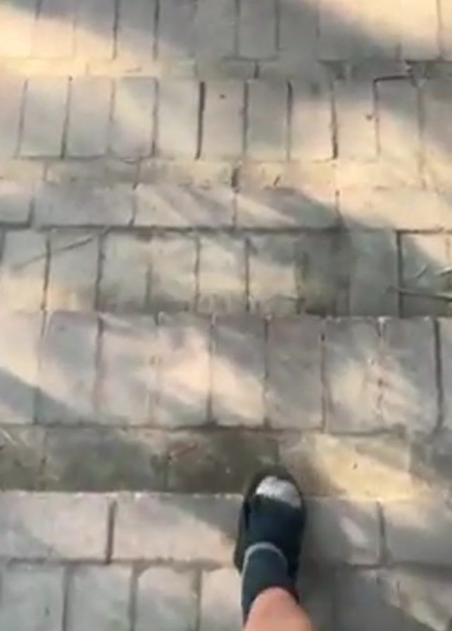 first-person view of someone walking up a set of stone stairs. The person is wearing socks and open-toed sandals. The stairs are made of rectangular stones, and there are some small twigs or debris scattered on the steps. The light casts shadows across the stairs.