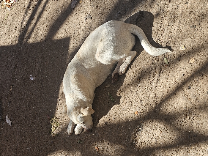- "In El Hajeb, Morocco, a light-colored dog is observed lying on its right side on dry, earthen ground under direct sunlight" by FM-HWmcZ2, licensed under CC BY 4.0