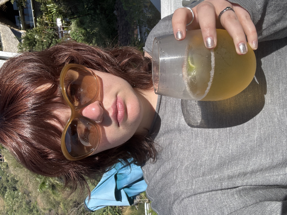 A person with reddish-brown, layered hair and bangs is depicted in a close-up, outdoors, under bright sunlight, within the city of San Pablo La Laguna, Guatemala. The individual wears large, amber-tinted cat-eye sunglasses and a small silver nose ring on the left nostril. They are dressed in a grey long-sleeved shirt. The right hand holds a clear, stemless glass containing a light amber carbonated beverage with ice and a lime wedge; the glass shows condensation. Fingernails on the right hand are painted metallic silver; a plain silver ring is on the ring finger, and a darker, textured ring with a green detail is on the pinky finger. In the background to the left, a light blue folded umbrella is visible, followed by a body of water and a steep, tree-covered hillside. To the right, behind the subject, a multi-level building with a distinctive thatched roof is visible on a lush green hillside.