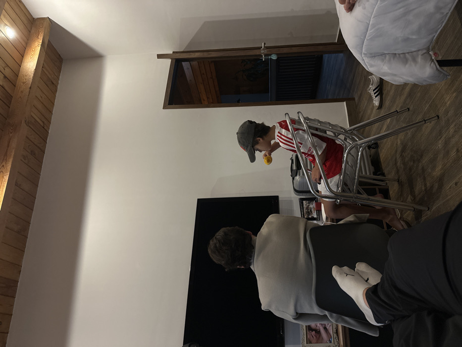 The image depicts an indoor scene in Jesús del Monte, Mexico. The environment consists of white walls, a wooden plank floor, and a ceiling with exposed wooden beams and planks, featuring a single recessed light fixture in the upper right. Three individuals are present. In the immediate foreground, a person's lower legs and feet, clad in black pants and white socks with a black logo, are visible, indicating a relaxed, elevated posture. To the left, an adult individual is seated with their back to the camera, wearing a light-colored long-sleeved garment, facing a large, dark-screened television. To the adult's right, a child is seated on a metallic chair, wearing a red and white striped soccer jersey with a "VISIT RWANDA" logo on the sleeve, dark shorts, and a grey baseball cap with a red logo. The child is holding a yellow object to their mouth. Objects present include the large, dark television screen mounted on the wall. Below the television, to the left, a framed photograph of two infants is displayed. To the right of the adult, a small black-framed item and a silver-colored wheeled suitcase are visible. On the far right, a bed with white quilted bedding is partially seen, with a pair of white Adidas sneakers with black stripes resting on the wooden floor beside it. A dark wooden door on the right side of the room is partially open, revealing a glimpse of an adjacent room with dark horizontal paneling.