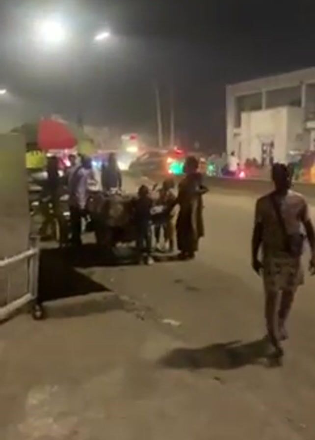 nighttime street scene. A group of people, including children, are gathered around a cart piled with goods. One person walks towards the camera while others are milling around the cart. There are streetlights illuminating the scene, and vehicle traffic is visible in the background, some with flashing lights. A white building is visible on the right side of the frame. There is an open-air tented structure on the left. The ground appears to be paved.