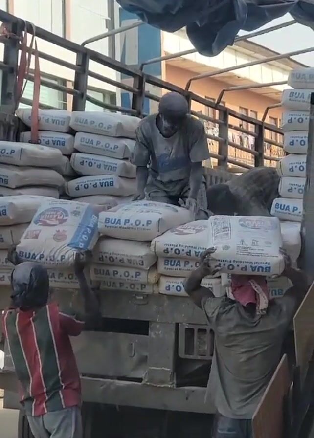 Several men are unloading bags of BUA P.O.P Special Moulding Plaster from the back of a truck. Two men stand on the ground, lifting the bags onto their heads, while another man on the truck passes them bags from the top layer. The truck is packed with bags, and the men are covered in white plaster dust. The background shows buildings and a cloudy sky.