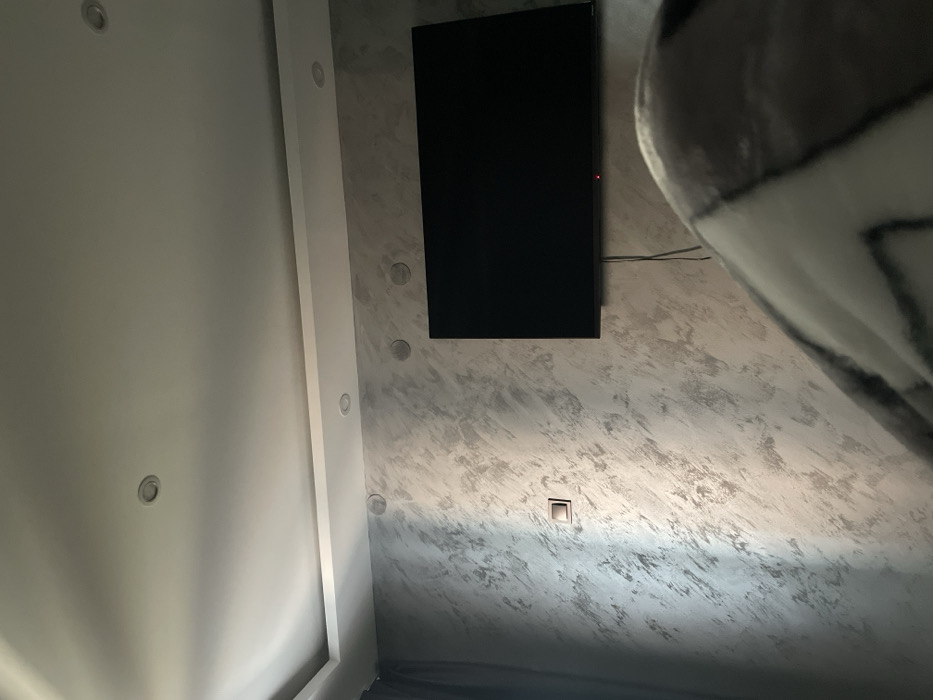 The image depicts an interior room in Yambol, Bulgaria. The upper section shows a white ceiling featuring a multi-level design with a recessed perimeter and three circular flush-mounted light fixtures. The wall below the ceiling is painted or textured in a light gray, mottled, or streaked pattern. Mounted on this wall, slightly right of center, is a large, black, rectangular flat-screen television, currently powered off, indicated by a small red light at its bottom edge. Two black electrical cables hang vertically beneath the television. To the left of the television, positioned higher on the wall, are three circular flush-mounted objects, consistent with ceiling speakers. Further left and lower on the wall, a single brown-colored electrical switch or outlet is visible. A dark curtain or drapery is present on the far left edge of the image. The lower right foreground is partially obscured by a gray and white patterned textile, likely a blanket or comforter. No individuals are visible.