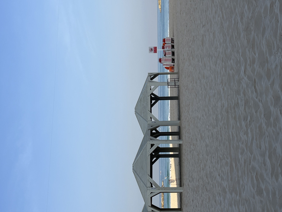 A beach scene shows a row of open-sided, white-framed structures, possibly shelters, extending into the sandy foreground