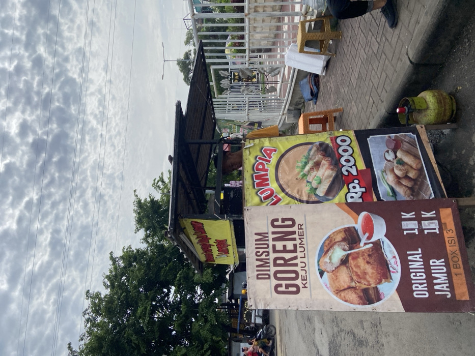A food stall displays signs advertising its menu. "Dimsum Goreng Keju Lumer" (fried dim sum with melted cheese) is priced at 1,000 Indonesian Rupiah for original and mushroom flavors, with a box of three available. Another sign advertises "Lompa" (spring rolls) for 2,000 Indonesian Rupiah. The stall is located outdoors, with glimpses of the sky, trees, and nearby buildings. A gas tank is visible near the signs.