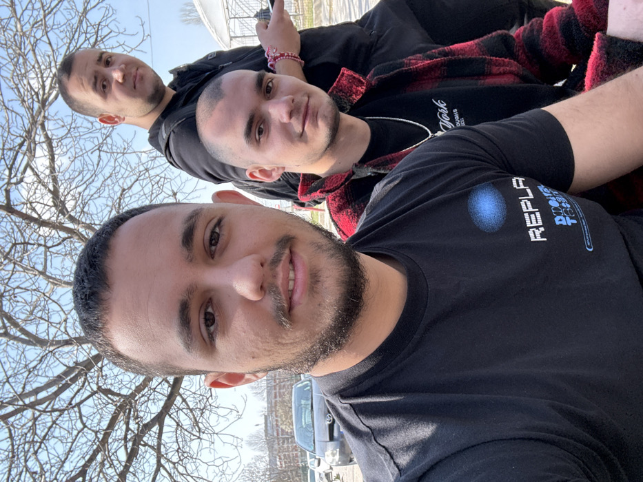 A daylight outdoor photograph captures three males in an urban environment in Plovdiv, Bulgaria. The primary subject in the foreground, taking the photo, is a male with short dark hair and a neatly trimmed beard, wearing a black t-shirt with "REPLAY DIGITAL THOUGHTS" text and a blue oval graphic. He looks directly at the camera with a slight smile. To his right, in the middle ground, another male with a shaved head and no facial hair wears a red and black plaid jacket over a black t-shirt featuring "New York" text and a silver chain with a pendant. He also looks towards the camera with a slight smile. Partially obscured behind them, to the right, a third male with short dark hair and minimal facial hair wears a black hooded jacket. He holds a dark-colored smartphone in his right hand and has multiple red and white bracelets on his right wrist, looking slightly away from the camera. The background features a large deciduous tree with bare branches under a clear blue sky. To the left, a silver Toyota Corolla and other parked vehicles are visible on a paved surface. In the far background, architectural structures include a large building with red accents, possibly a stadium or sports complex, and a white, tent-like structure. The scene is illuminated by natural sunlight.