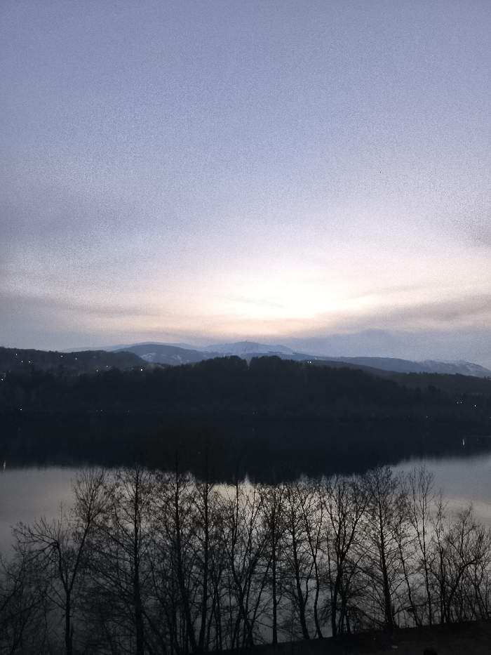 The image displays an unpopulated outdoor landscape scene located in Pancharevo, Bulgaria, captured during low light conditions consistent with dawn or dusk. The upper half of the frame is dominated by a hazy sky, transitioning from a pale blue-grey at the top to a subtle yellowish-pink glow along the central horizon line. Below the sky, a series of dark, forested hills are visible, with scattered artificial lights indicating distant settlements on their slopes. Further behind these, additional mountain ranges appear lighter and hazier, with some distant peaks showing traces of snow. A large, calm body of water, presumably Pancharevo Lake, occupies the mid-ground, reflecting the silhouetted hills and the sky. The immediate foreground features a dense line of bare deciduous trees, their leafless branches silhouetted against the water and the distant landscape. No individuals, specific actions, or interactions are present in the scene.