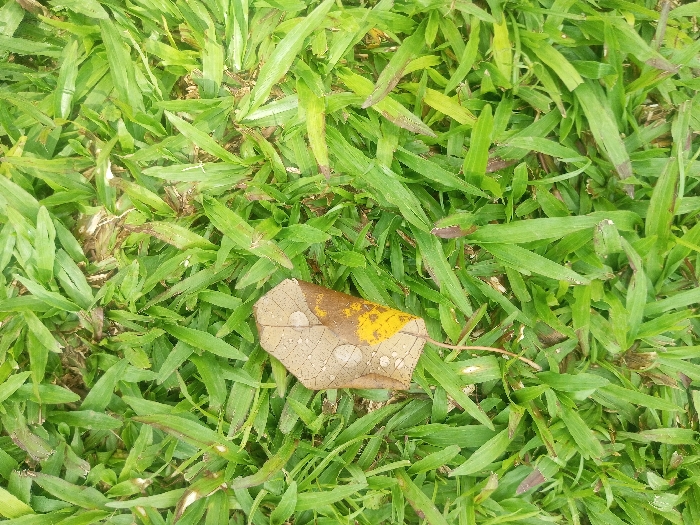 - "A single, senescent broadleaf rests on a dense bed of green grass in the city of Đăk Pxi, Vietnam" by FM-HvO5s1, licensed under CC BY 4.0