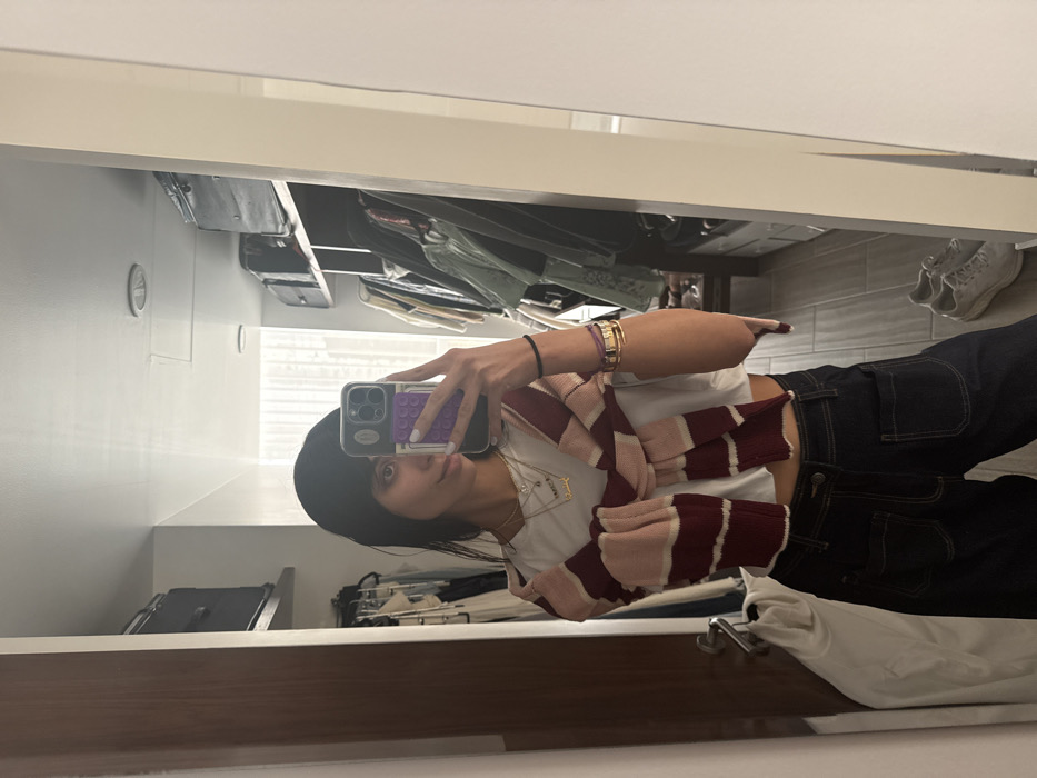 A mirror selfie shows a young woman wearing dark jeans, a white t-shirt, and a striped scarf in shades of red and light pink