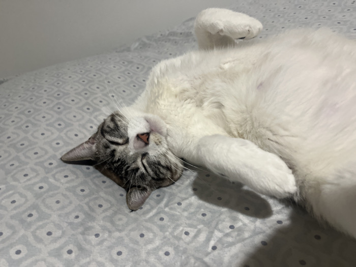 - "A domestic cat lies on its back, eyes closed, appearing to sleep, on a light grey bedsheet with a repeating geometric pattern of interconnected squares and central dots" by FM-O7LmK2, licensed under CC BY 4.0