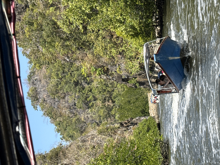 A boat ride navigating a channel. A blue boat with several people aboard cuts through the water, creating a white wake. The channel is flanked by lush green vegetation and rocky cliffs covered in trees. The sky is partly visible, suggesting a clear day. The perspective appears to be from another boat, with part of its structure visible on the left.