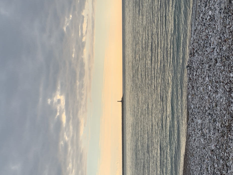 The image displays a coastal scene in Bar, Montenegro, at an unspecified time, likely dawn or dusk. The foreground consists of a pebble beach, densely covered with light grey and white stones of varying sizes, leading to the waterline. The midground is dominated by the calm sea, characterized by subtle horizontal ripples and a gradual color shift from a light greenish-blue near the shore to a deeper grey-blue further out. In the background, a long, dark breakwater extends horizontally across the frame, with a slender, dark-colored lighthouse standing on its left-central section. The sky above the horizon exhibits scattered grey clouds interspersed with areas of pale orange-yellow and faint blue, indicating a low sun angle. No individuals, animals, or active events are depicted.
