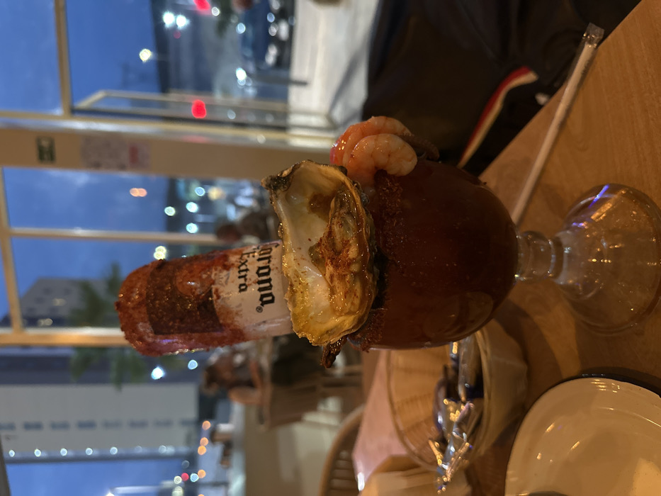 A Michelada-style cocktail is on a wooden table. A Corona beer bottle, rimmed with chili powder, is inserted into the drink. An oyster shell and several shrimp sit on the rim of the glass. A straw is placed nearby. The outdoor scene is visible through the window in the background. A white plate and metallic silverware are on the table.