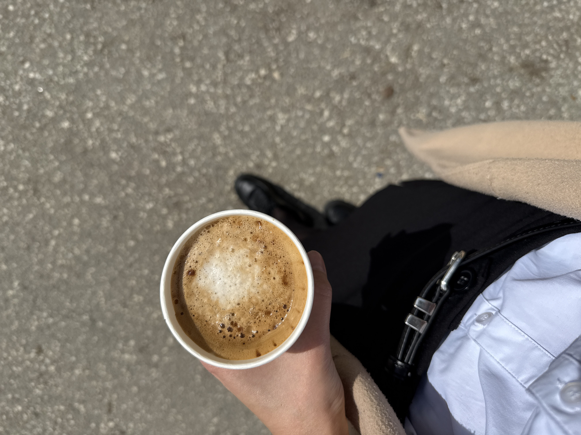 A first-person, overhead shot shows a hand holding a white paper cup filled with a brown beverage topped with foam, presumably coffee. The background features a grey, textured surface, likely pavement. In the periphery, elements of the person's outfit are visible: a black shoe, a white collared shirt partially obscured by black clothing and a beige coat or jacket. The location in the city of Pleven, Bulgaria is not identifiable in the image.