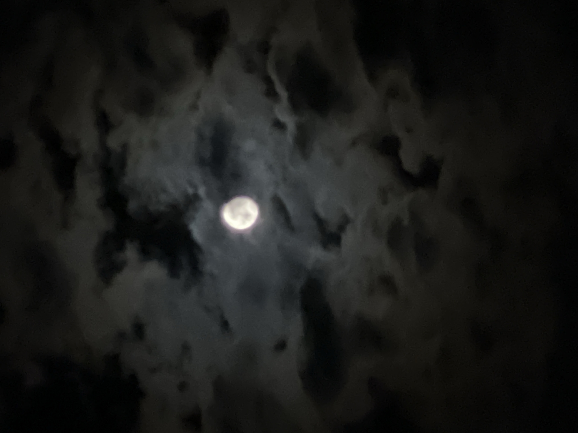 The image depicts a night scene in Svilengrad, Bulgaria, with the moon partially obscured by clouds. The moon is a bright, slightly blurred orb positioned near the center of the frame. Thick, dark clouds surround the moon, creating a dramatic and somewhat indistinct backdrop. The overall lighting is dim, contributing to a sense of nocturnal obscurity. No people or distinct objects other than the moon and clouds are visible.