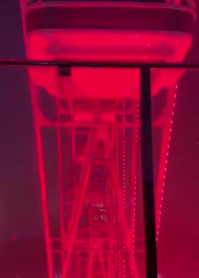 view looking down from a moving gondola on a Ferris wheel. The Ferris wheel is lit up in red light, and a safety railing is visible at the bottom of the frame. The structure of the Ferris wheel is visible through the red light. There is a slight fog or haze in the air.