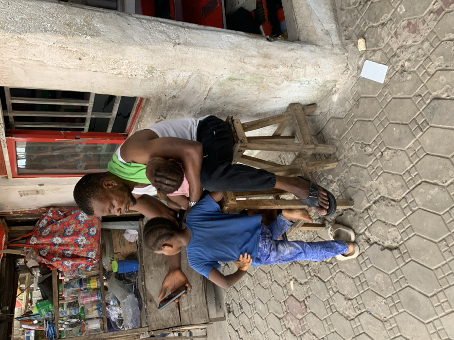 The scene in Lokoja, Nigeria, depicts three individuals in an outdoor, semi-covered area in front of a building that appears to house a small retail stall
