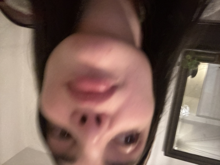 The scene, located in Roanne, France, depicts a close-up, blurry portrait of an individual's face, captured from a low perspective looking upwards. The subject, likely female, features dark hair, a prominent nose, and full lips. A light-colored headband is visible across the forehead, with dark hair framing the face. The eyes are partially visible near the top of the frame, directed slightly upwards. In the upper-left background, a dark-framed mirror reflects a white ceiling and a distinct white light fixture, which appears to have a feathery or spiky texture. Below the mirror, dark shapes and faint green foliage are discernible. The background to the right is a plain, light-colored wall. A patterned fabric, possibly part of the subject's clothing, is subtly visible at the bottom right.