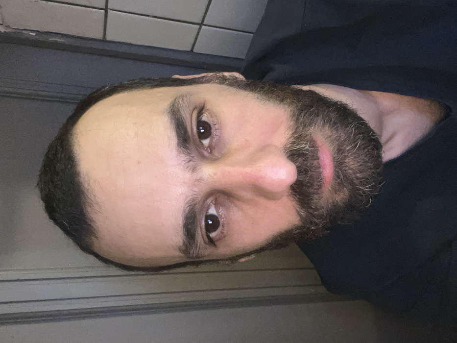 A head-and-shoulders portrait depicts an adult male with a medium skin tone, short dark hair, and a full dark beard displaying some grey hairs