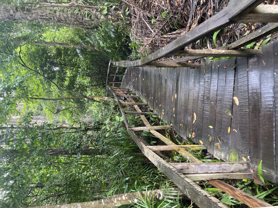 This image depicts a wooden boardwalk traversing a dense, tropical forest in the city of Ikota, Nigeria