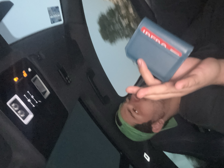 Inside a moving vehicle in Mexico City, Mexico, a young adult male occupies the driver's seat. He wears a light green baseball cap backward and a dark t-shirt. His head is tilted back, with his mouth slightly open. In his left hand, he holds a small, rectangular, light blue device with a prominent red vertical strip on the right side bearing white text that appears to read "INFRA." This device is positioned near his mouth, suggesting inhalation. His right hand is raised, fingers splayed and blurred, partially obscuring his face. The vehicle's interior is dark, featuring a sunroof and an overhead console with illuminated controls. Through the windshield, a blurred exterior view shows a green tree and a light blue sky, indicating movement during daytime or twilight. A "VERIFICACION 2022 1ER SEMESTRE" sticker, indicative of a Mexico City vehicle emissions program, is visible on the upper right portion of the windshield.