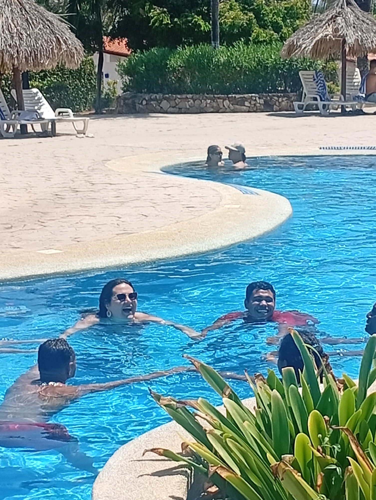 The image depicts a group of people enjoying a swimming pool. The pool appears to be part of a resort or hotel. Several individuals are in the water, holding hands and interacting. The water is a vibrant blue. In the background, there are thatched umbrellas, lounge chairs, and other poolside elements. The location is Playa El Agua, Venezuela.