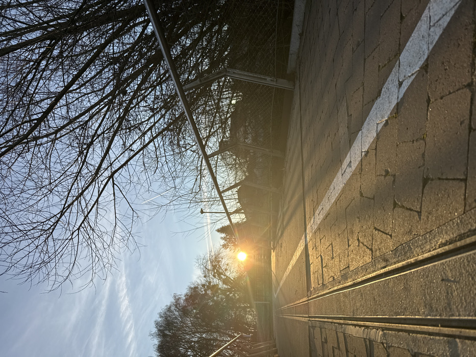 The image displays a paved pathway, likely a bridge or elevated walkway, in Olingen, Luxembourg. The path is constructed from rectangular pavers and features a distinct white painted line running longitudinally along its right side. On the left side of the path, two parallel metal rails, resembling tracks or drainage channels, are embedded. Both sides of the pathway are bordered by modern metal guardrails, characterized by curved supports and a lower section of wire mesh. The sun is positioned low and centrally in the mid-distance, emitting a bright orange-yellow light that creates a prominent lens flare and casts long, sharp shadows extending towards the viewer. The sky above is a clear light blue, accented by scattered wispy white clouds and a faint aircraft contrail. Bare tree branches, indicative of a dormant season, are silhouetted against the sky, particularly dense on the right side. Additional leafless trees and the partial view of distant building structures are visible beyond the pathway. No individuals or dynamic actions are present within the scene.