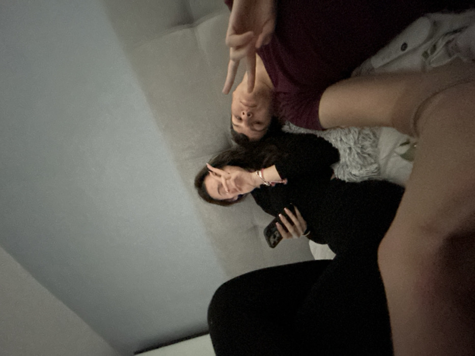 An indoor scene depicts three individuals relaxing in what appears to be a bedroom or living room within a private residence in Kozloduy, Bulgaria; the specific address or building is not identifiable. The image is taken from a low-angle perspective, with dim, ambient lighting. In the mid-ground, a female with dark hair, wearing a black long-sleeved top, is seated or reclining against a light gray padded headboard or backrest. She holds a dark-colored smartphone in her left hand and makes a 'peace' sign with her right hand, partially obscuring her face. Several bracelets are visible on her right wrist. To her right, a male with short, dark hair, wearing a maroon t-shirt, reclines alongside her, his head resting against the padded surface or a light gray fluffy pillow. He also makes a 'peace' sign with his right hand. In the extreme foreground, a portion of a leg and thigh, clad in dark material, is visible on the left, belonging to the individual operating the camera. The background consists of a plain, light gray wall or ceiling. No other discernible objects or specific room details are present.