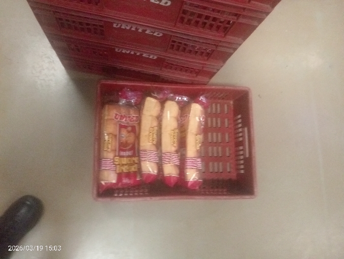 Location: Unknown. An overhead photograph captures an indoor scene featuring packaged bread rolls and red plastic crates on a light-colored floor. In the upper left quadrant, a stack of at least two red plastic crates is visible, each bearing the word "UNITED" in white lettering. A single red plastic basket, identical in design to the stacked crates, is centrally positioned in the lower half of the frame. Inside this basket are four individually packaged bread rolls. Each roll is light-colored, encased in clear plastic packaging featuring prominent red and white striped branding, with partially visible text such as "SNACK BREAD" and "UNITED" on the leftmost package. A dark, out-of-focus, elongated object is partially visible in the bottom left corner. No individuals are present. A digital timestamp, "2026/03/19 15:03", is embedded in the bottom left.