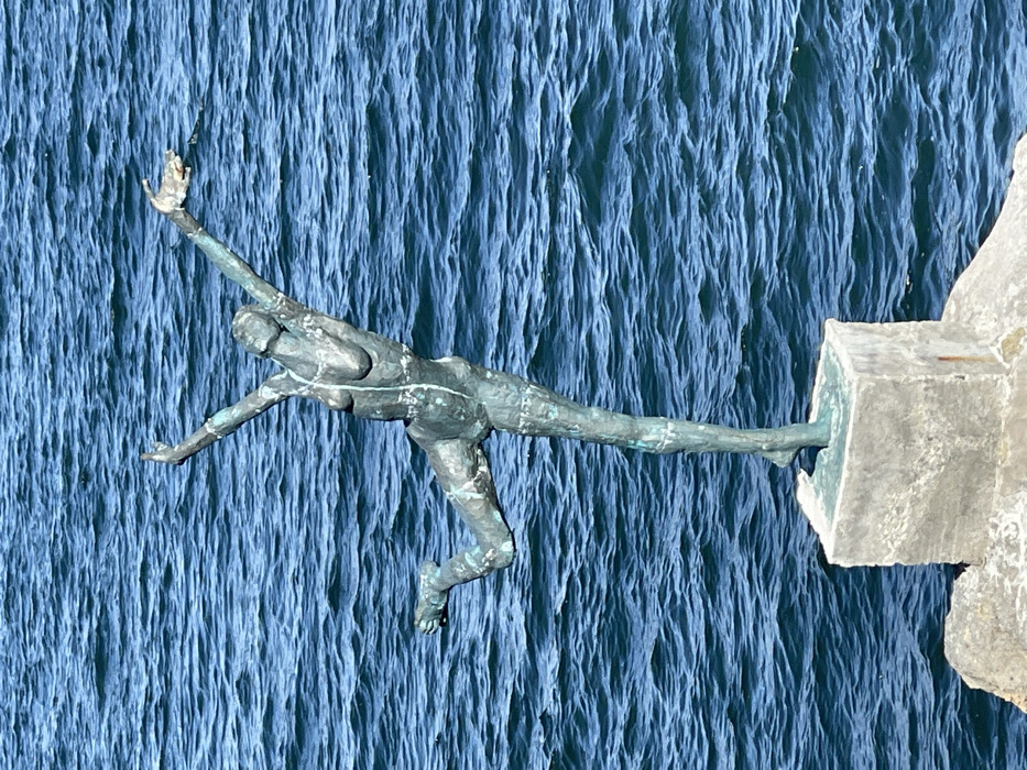 A verdigris-patinated bronze statue of a nude female figure is depicted in a dynamic, dancing pose. The figure stands on her left foot, with her right leg bent at the knee and extended backward. Both arms are raised overhead and extended outwards, palms open, with the head tilted slightly upwards and to the right. The statue's surface displays a textured finish and areas of bluish-green oxidation. It is mounted on a light grey concrete pedestal, which in turn rests on a larger, rough concrete or stone base. The background consists entirely of deep blue water, showing numerous small surface ripples, indicative of a sea under calm conditions and bright daylight. This scene is situated along the waterfront of Sozopol, Bulgaria, overlooking the Black Sea.
