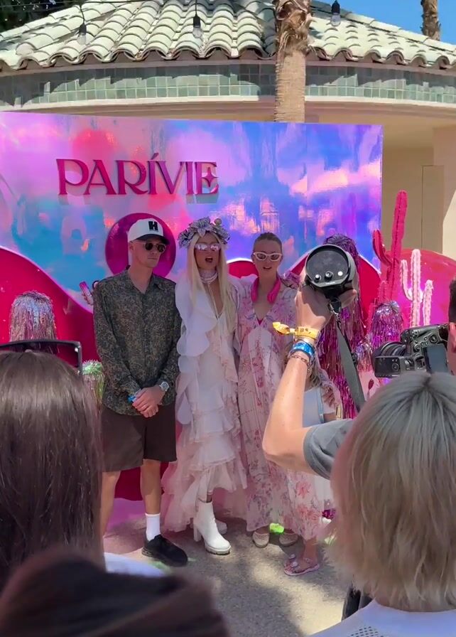 The video captures a public outdoor event featuring a backdrop with the word "PARÍVIE" in large pink letters against a vibrant, swirling pink and blue holographic design. Three people are standing in front of the backdrop for a photo opportunity. A slender, fair-haired woman in the center wears a frilly white dress with a floral headpiece and pink sunglasses. Standing to her left is a thin male in a patterned short-sleeved shirt, brown shorts, and a white baseball cap. To the woman’s right, another slender, fair-haired woman in a floral dress and sunglasses stands. The photographer is holding a camera and light equipment. A small girl in a white dress is slightly obscured to the right of the second woman. Several people, likely other attendees or photographers, are visible in the foreground, framing the central group. The event appears to be well-lit, taking place on a sunny day, with palm trees and other tropical plants in the background. A decorative building with a multi-tiered roof is also visible.