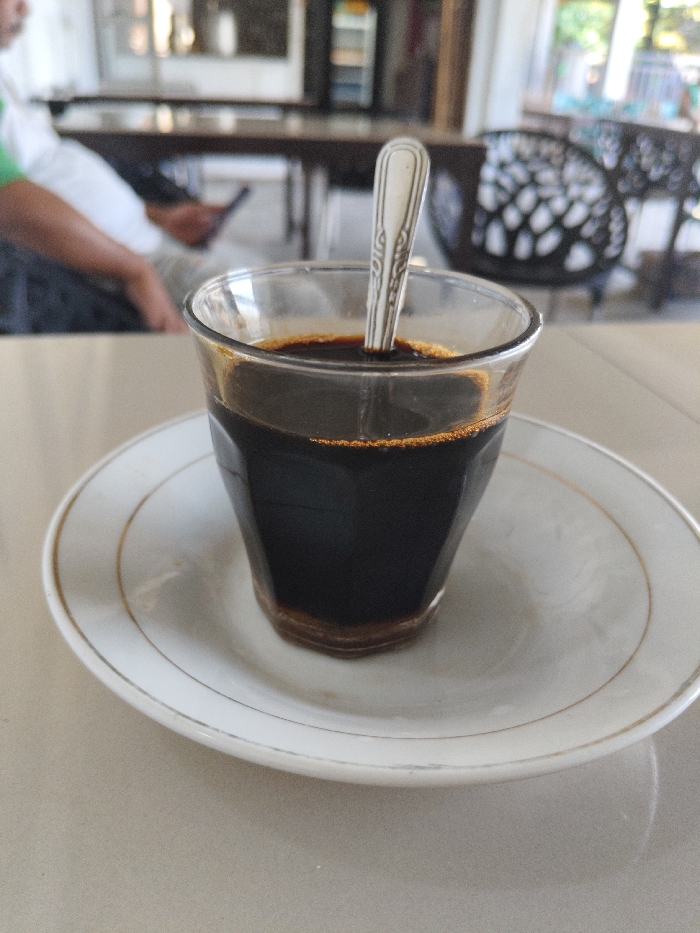 - "A small, clear glass of dark coffee sits on a white saucer with a thin gold ring" by FM-bZrK33, licensed under CC BY 4.0