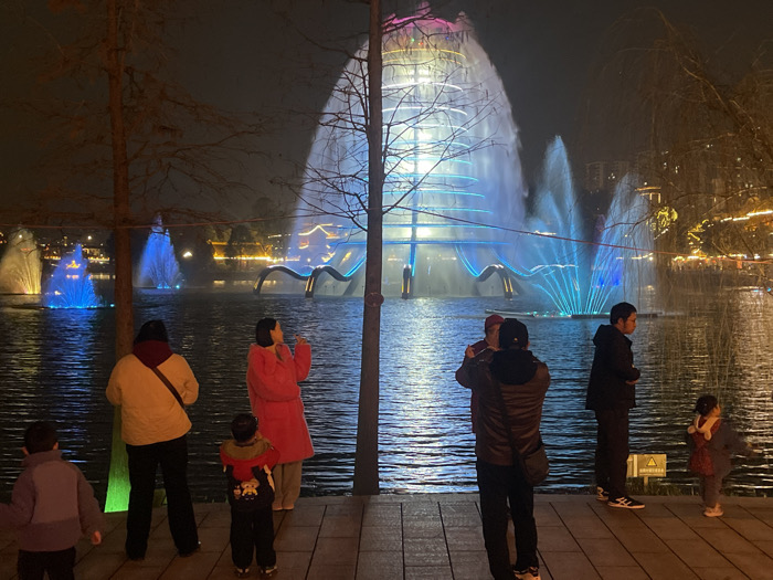 The image captures a nighttime scene at Bishan Lake Park in Bishan, China, focusing on a vibrant water and light show displayed on a large lake. In the mid-ground, a prominent fountain emits water upwards in a conical formation, illuminated with blue and white lights and accented by horizontal light rings. To its right, multiple vertical water jets also glow blue, with additional blue-lit fountains visible further across the water. The background reveals dimly illuminated buildings and treelines bordering the far side of the lake. In the foreground, a group of eight individuals, including adults and children, stands on a paved embankment, largely observed from behind or in profile, all facing the water and the light show. One adult, wearing a dark brown quilted jacket and a baseball cap, is seen holding a dark object, likely a smartphone, upwards to photograph the display. Another adult, dressed in a bright pink fuzzy coat, stands in profile with a raised hand, seemingly gesturing towards the scene. Two smaller children are positioned near adults on the left and center, while another child stands alone on the far right. Bare-branched trees partially frame the scene from the foreground, and a yellow triangular warning sign is visible on the paved surface near the child on the right.